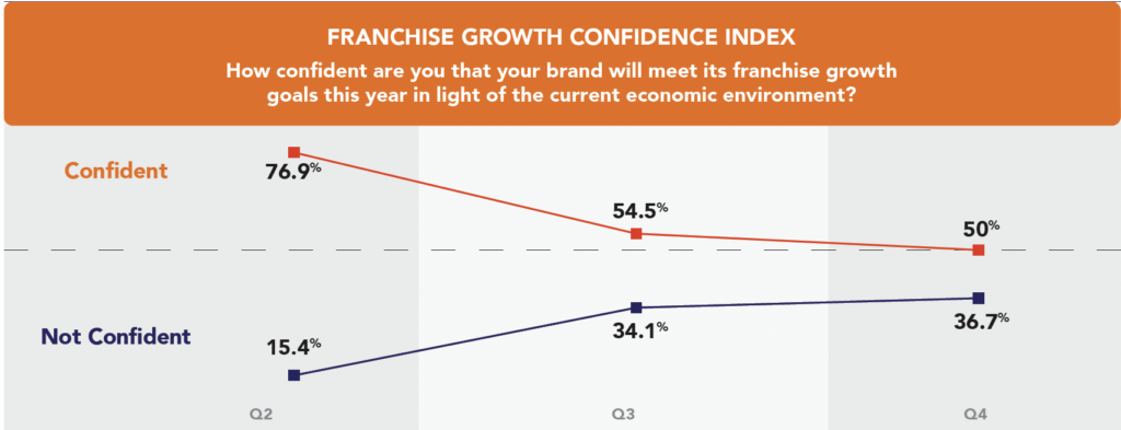 To assess the impact of current economic conditions on franchisors’ growth prospects, BoeFly has released its third quarterly Franchise Growth Confidence Index. This latest report, conducted from Nov. 10 to Nov. 28, 2023, requested input from nearly 700 CEOs, CFOs, and CDOs representing a diverse range of industries, including automotive, pet care, education, fitness, health/beauty, home services, restaurant, and retail. Building upon data from the two previous quarterly surveys, the aim was to determine whether significant shifts in franchisor executive confidence regarding domestic growth goals occurred throughout the year. Survey participants were asked to rate their confidence levels on a scale of 1 (not confident) to 7 (completely confident) in achieving their brand’s franchise growth targets for the current year. Subsequently, they were presented with additional questions designed to address pertinent economic concerns and gauge how these factors had influenced their confidence levels since the previous quarter.