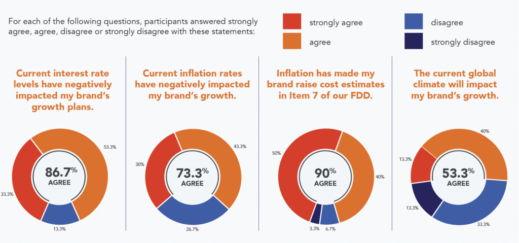 Respondents appear to be less pessimistic when it comes to inflation having a negative impact on their growth goals, with a decrease of 13% (from 86.4% to 73.3%) between the two most recent surveys. When assessing the relationship between inflation and increases in costs associated with Item 7 of franchisors’ FDD, a clear majority (90% of respondents) agreed, suggesting that the impact of inflation, although perceived as improving, has already been priced into Item 7 of the FDD.
