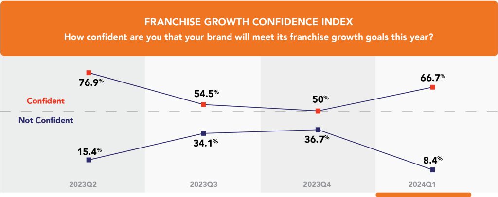 Overall, a majority of respondents (66.7%) reported they are at least confident that they will meet their franchise growth goals for the year. This was a significant shift from the previous quarter’s results in which the total confidence levels of respondents when combined reached just 50%. Further insights include: