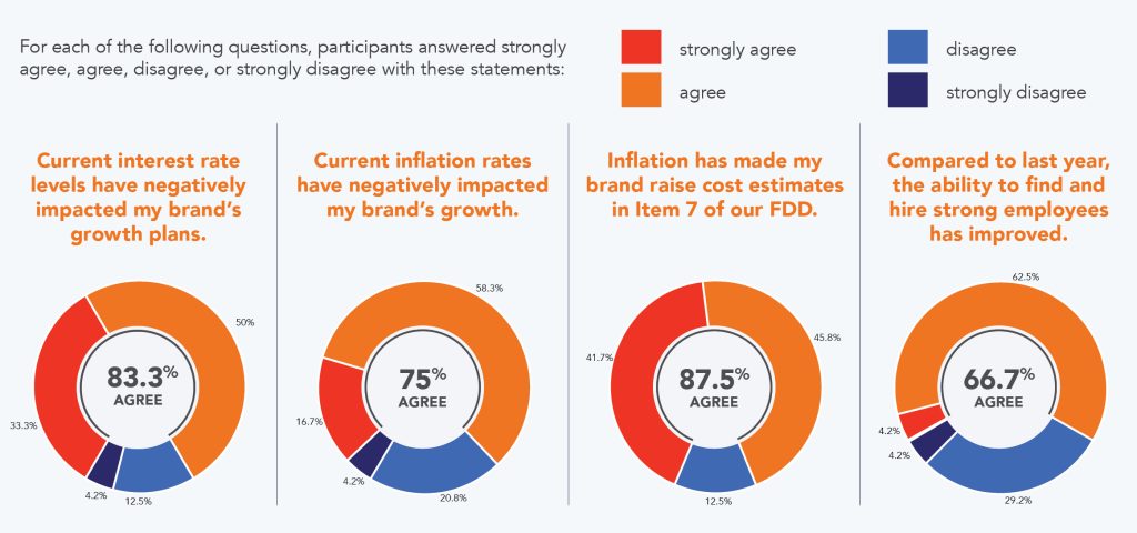 - A clear majority (75%) of those surveyed significantly agreed that inflation has negatively impacted their growth goals. When looking at the relationship between inflation and its effect on cost estimates, a notable 87.5% of respondents agreed that inflation has caused their brand to raise cost estimates in Item 7 of respective Franchise Disclosure Documents (FDDs).