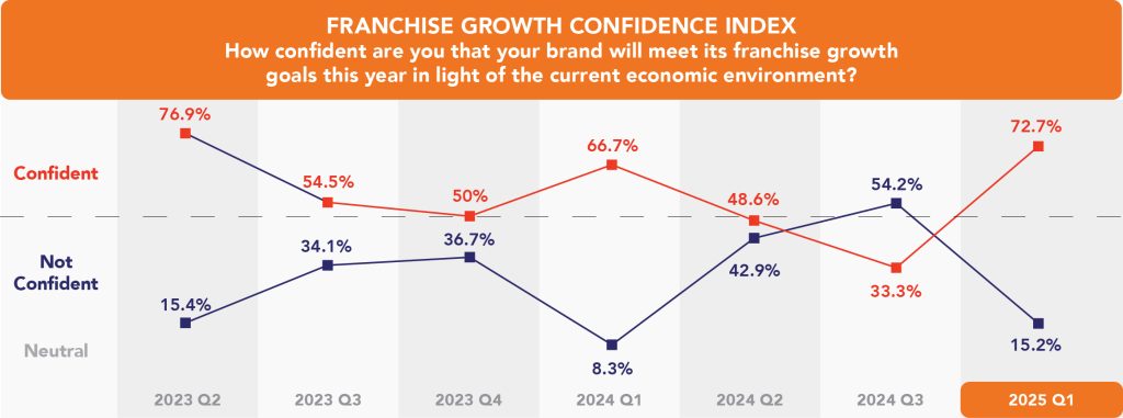 This quarter, nearly three-quarters (72.7%) of the respondents expressed at least some confidence in meeting their franchise growth goals for this year, showing a substantial increase in optimism compared to the previous quarter.