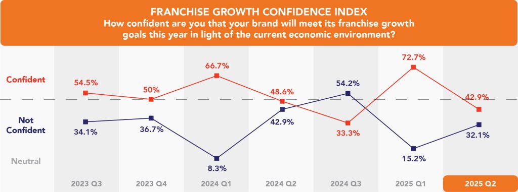 This quarter, confidence declined notably from the previous quarter, with only 42.9% of franchisors expressing some level of confidence in meeting their growth targets — down from 72.7% in Q1 2025. Additional insights include: