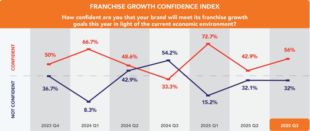 This quarter, 56% of franchisors expressed some level of confidence in meeting their growth targets — down from 72.7% in Q1 in 2025 but a rebound from 42.9% in Q2. Additional insights include: